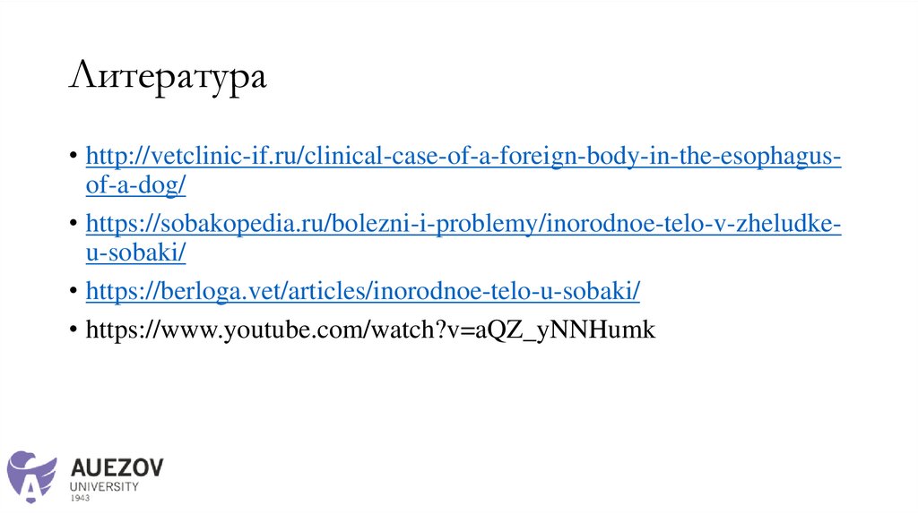 Литература• http://vetclinic-if.ru/clinical-case-of-a-foreign-body-in-the-esophagusof-a-dog/