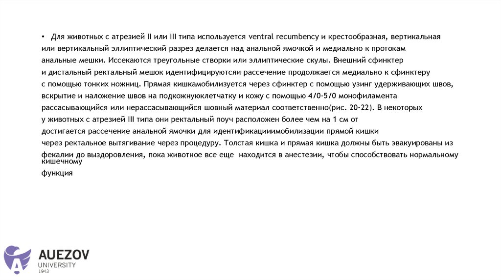 • Для животных с атрезией II или III типа используется ventral recumbency и крестообразная, вертикальнаяили вертикальный эллиптический разрез делается над анальной ямочкой и медиально к протокам