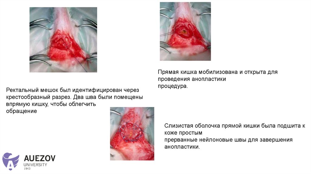 Ректальный мешок был идентифицирован черезкрестообразный разрез. Два шва были помещены
