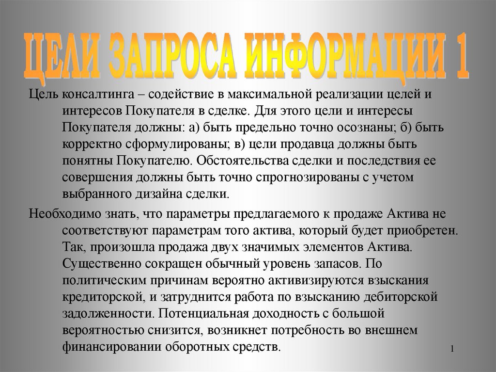 Цель консалтинга – содействие в максимальной реализации целей иинтересов Покупателя в сделке. Для этого цели и интересы