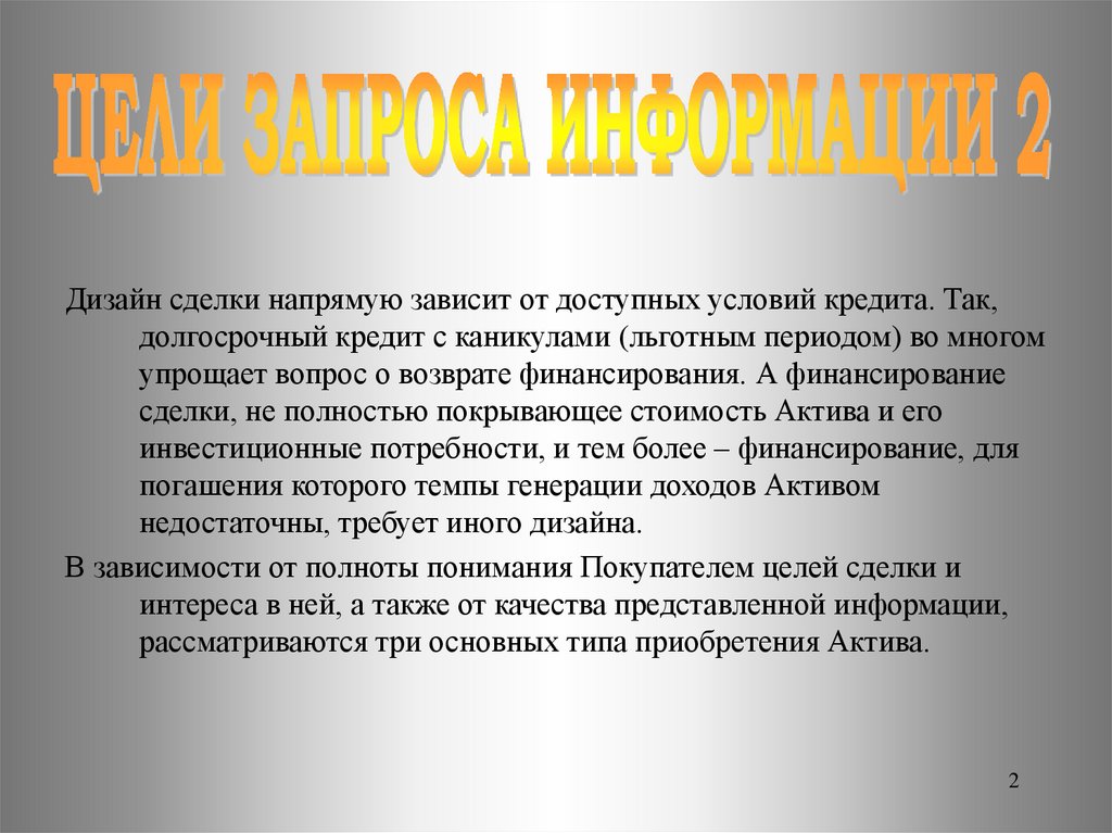 Дизайн сделки напрямую зависит от доступных условий кредита. Так,долгосрочный кредит с каникулами (льготным периодом) во многом