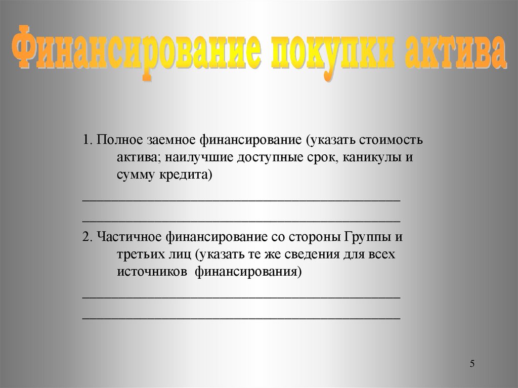 1. Полное заемное финансирование (указать стоимостьактива; наилучшие доступные срок, каникулы и
