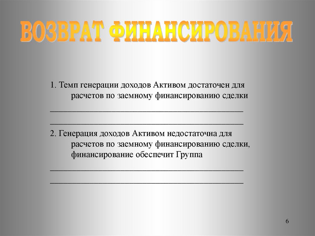1. Темп генерации доходов Активом достаточен длярасчетов по заемному финансированию сделки