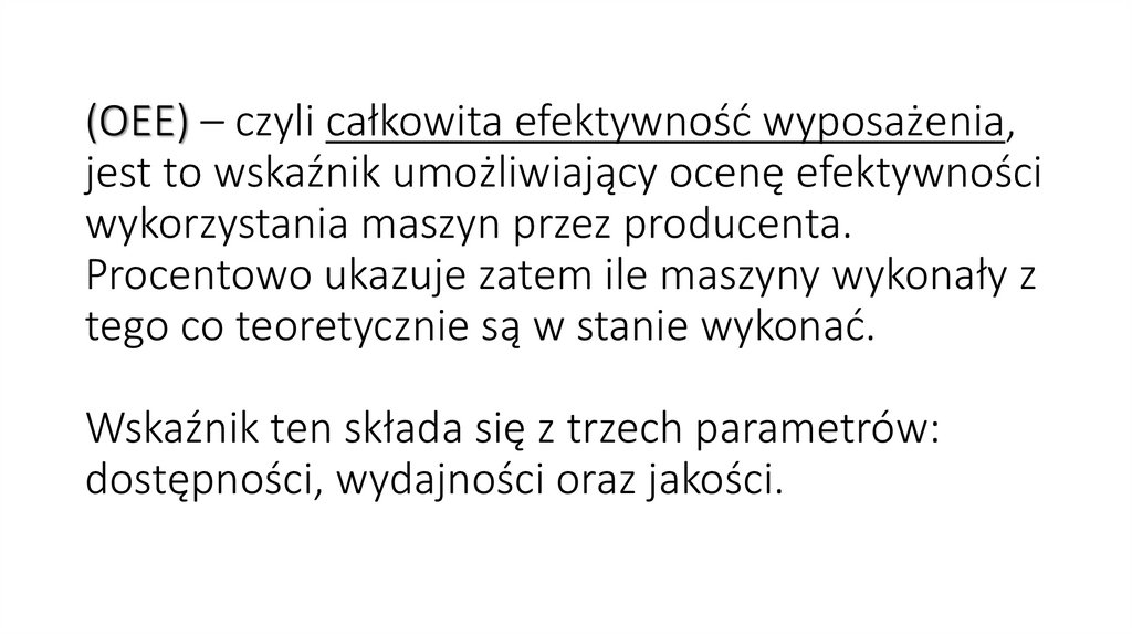 (OEE) – czyli całkowita efektywność wyposażenia,jest to wskaźnik umożliwiający ocenę efektywności