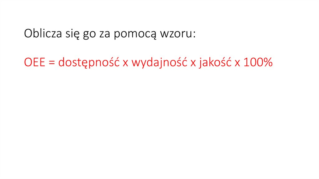 Oblicza się go za pomocą wzoru:OEE = dostępność x wydajność x jakość x 100%