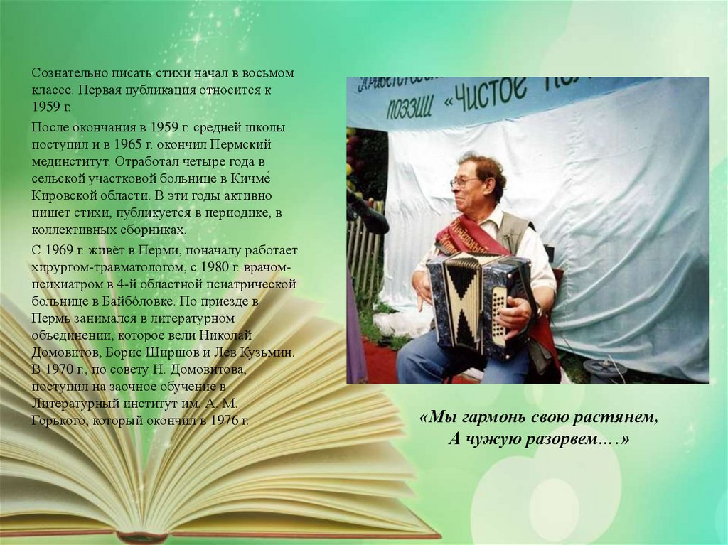Сознательно писать стихи начал в восьмомклассе. Первая публикация относится к