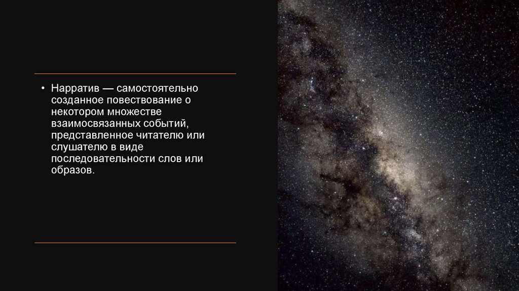 • Нарратив — самостоятельносозданное повествование о