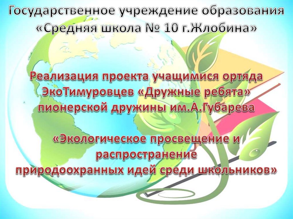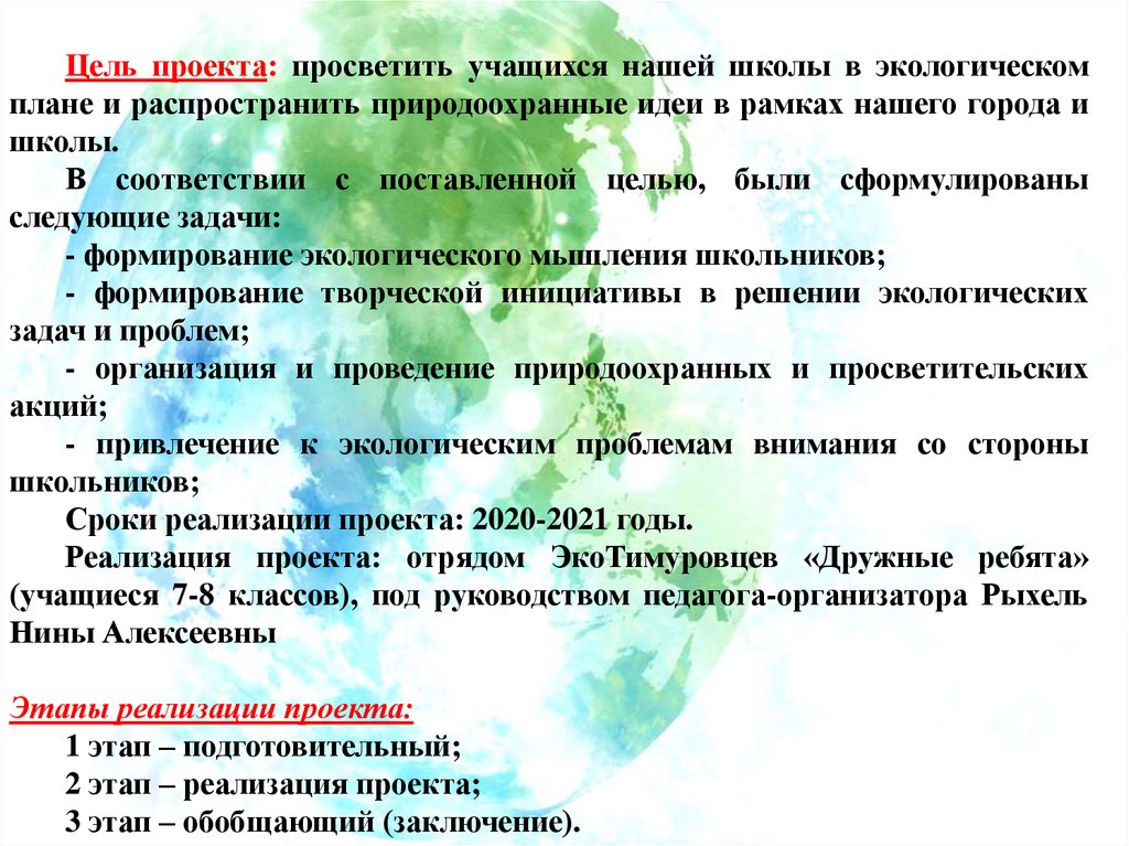 Цель проекта: просветить учащихся нашей школы в экологическомплане и распространить природоохранные идеи в рамках нашего города и
