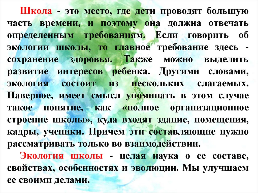 экологии школы, то главное требование здесь сохранение здоровья. Также можно выделить