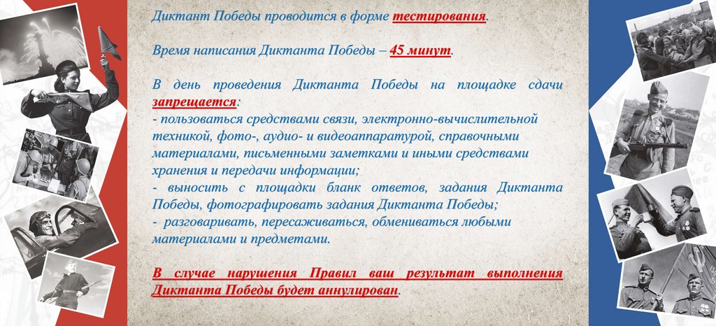 Диктант Победы проводится в форме тестирования.Время написания Диктанта Победы – 45 минут.