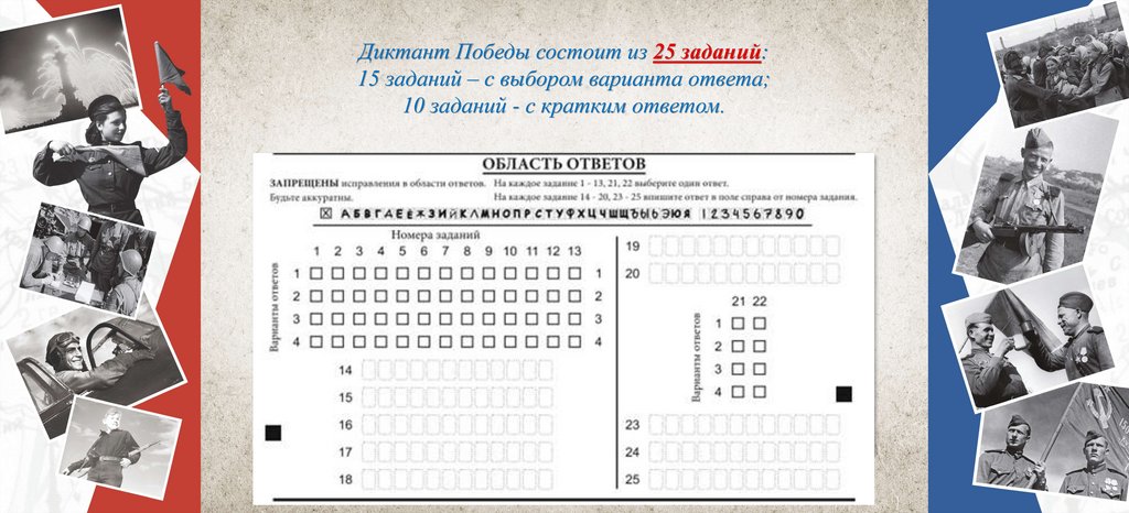 Диктант Победы состоит из 25 заданий:15 заданий – с выбором варианта ответа;