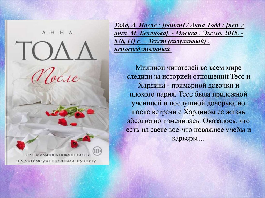 Тодд, А. После : [роман] / Анна Тодд ; [пер. сангл. М. Белякова]. - Москва : Эксмо, 2015. 536, [3] с. – Текст (визуальный) :