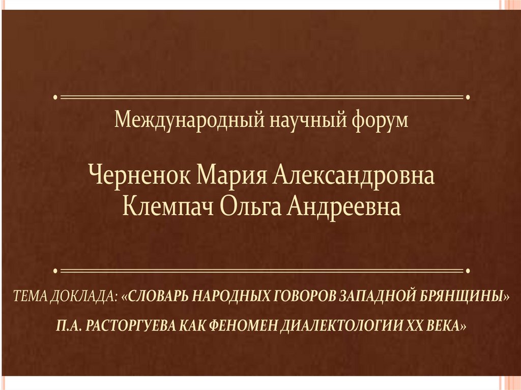 ТЕМА ДОКЛАДА: «СЛОВАРЬ НАРОДНЫХ ГОВОРОВ ЗАПАДНОЙ БРЯНЩИНЫ»