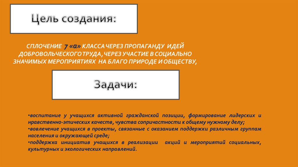 СПЛОЧЕНИЕ 7 «а» КЛАССА ЧЕРЕЗ ПРОПАГАНДУ ИДЕЙДОБРОВОЛЬЧЕСКОГО ТРУДА, ЧЕРЕЗ УЧАСТИЕ В СОЦИАЛЬНО