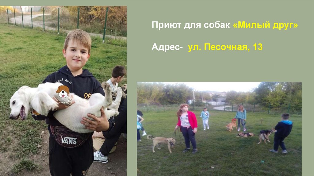 Приют для собак «Милый друг»Адрес- ул. Песочная, 13