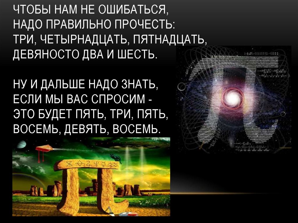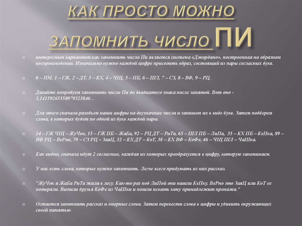 Давайте попробуем запомнить число Пи до двадцатого знака после запятой. Вот оно 3,14159265358979323846…