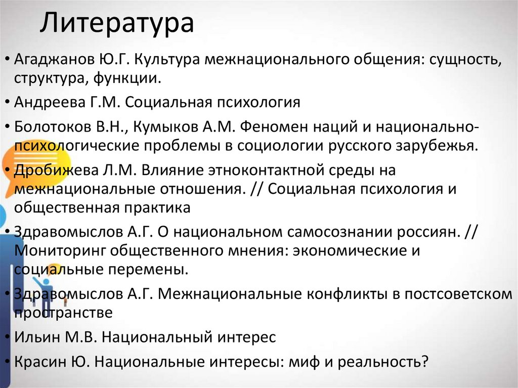Литература• Агаджанов Ю.Г. Культура межнационального общения: сущность,