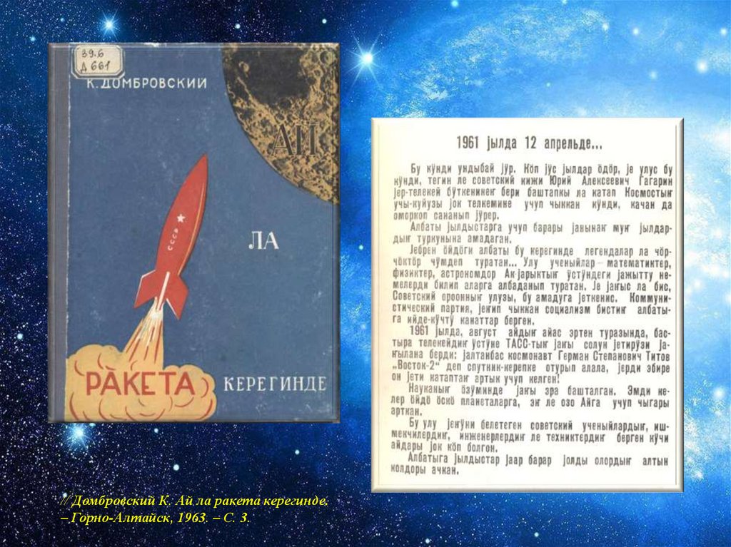 // Домбровский К. Ай ла ракета керегинде.– Горно-Алтайск, 1963. – С. 3.