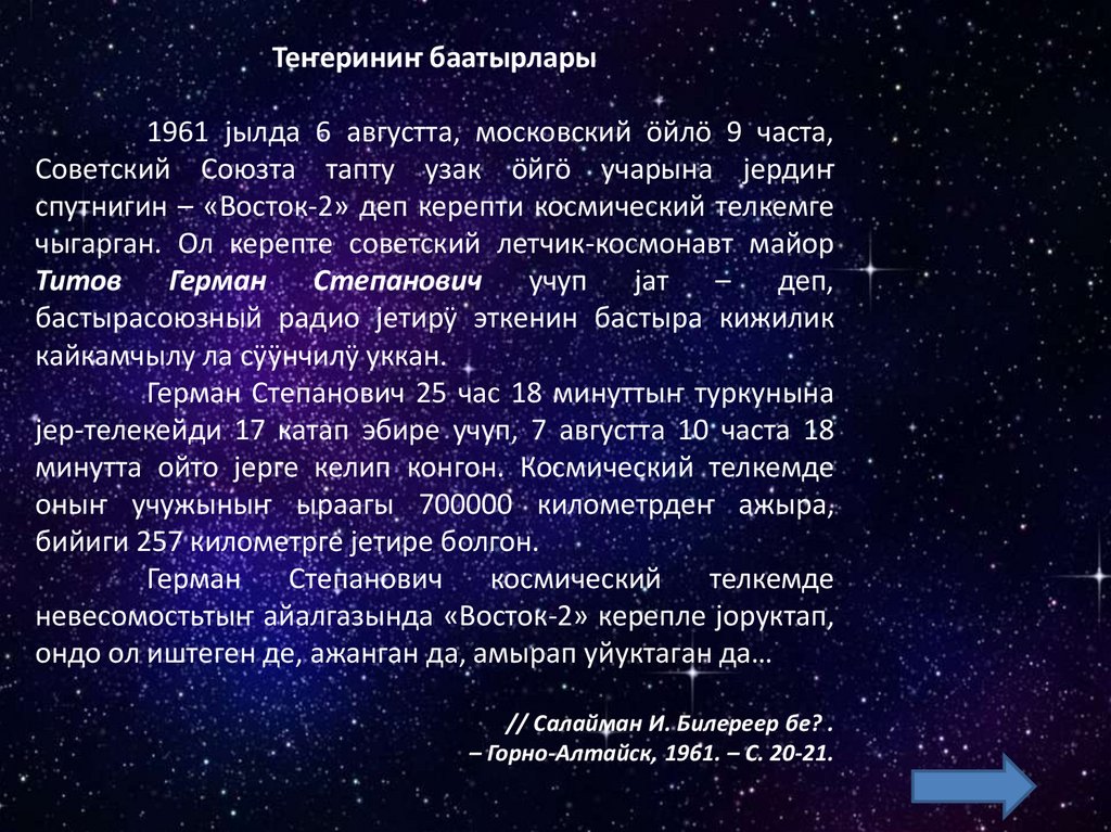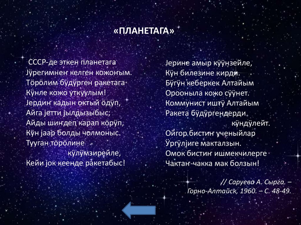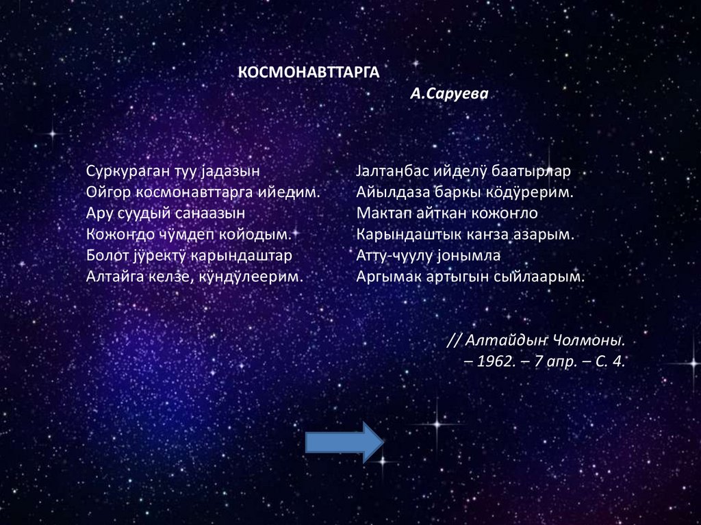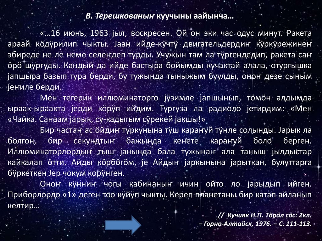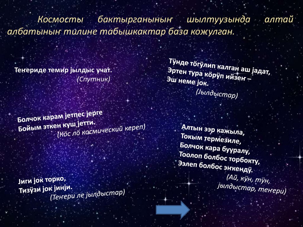 Космосты бактырганыныҥ шылтуузындаалбатыныҥ тилине табышкактар база кожулган.