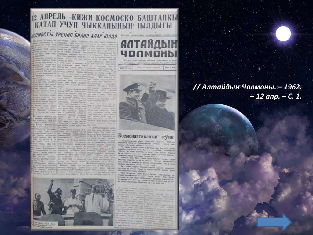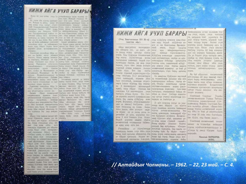 // Алтайдыҥ Чолмоны. – 1962.– 12 апр. – С. 1.