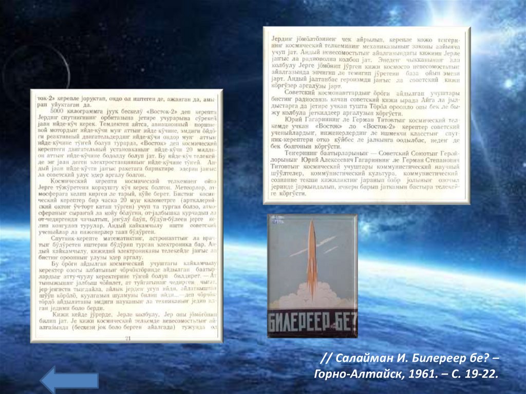 // Салайман И. Билереер бе? –Горно-Алтайск, 1961. – С. 19-22.