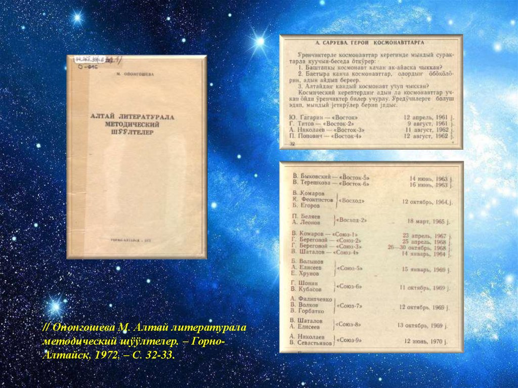// Опонгошева М. Алтай литератураламетодический шӱӱлтелер. – ГорноАлтайск, 1972. – С. 32-33.