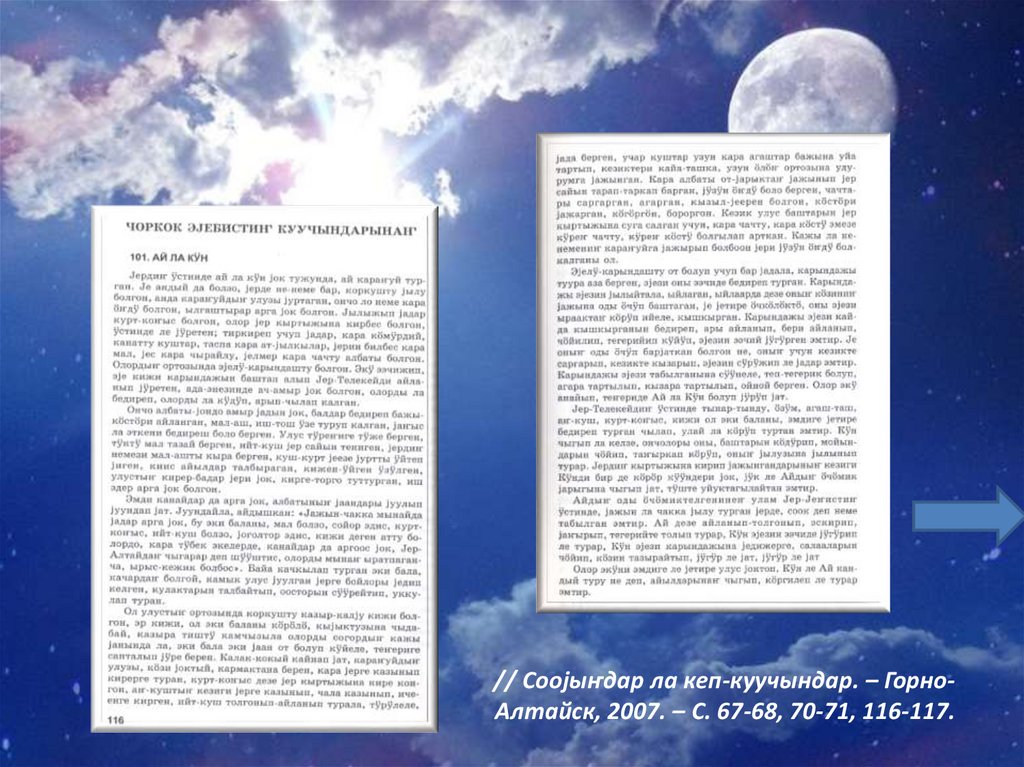 // Сооjыҥдар ла кеп-куучындар. – ГорноАлтайск, 2007. – С. 67-68, 70-71, 116-117.32.