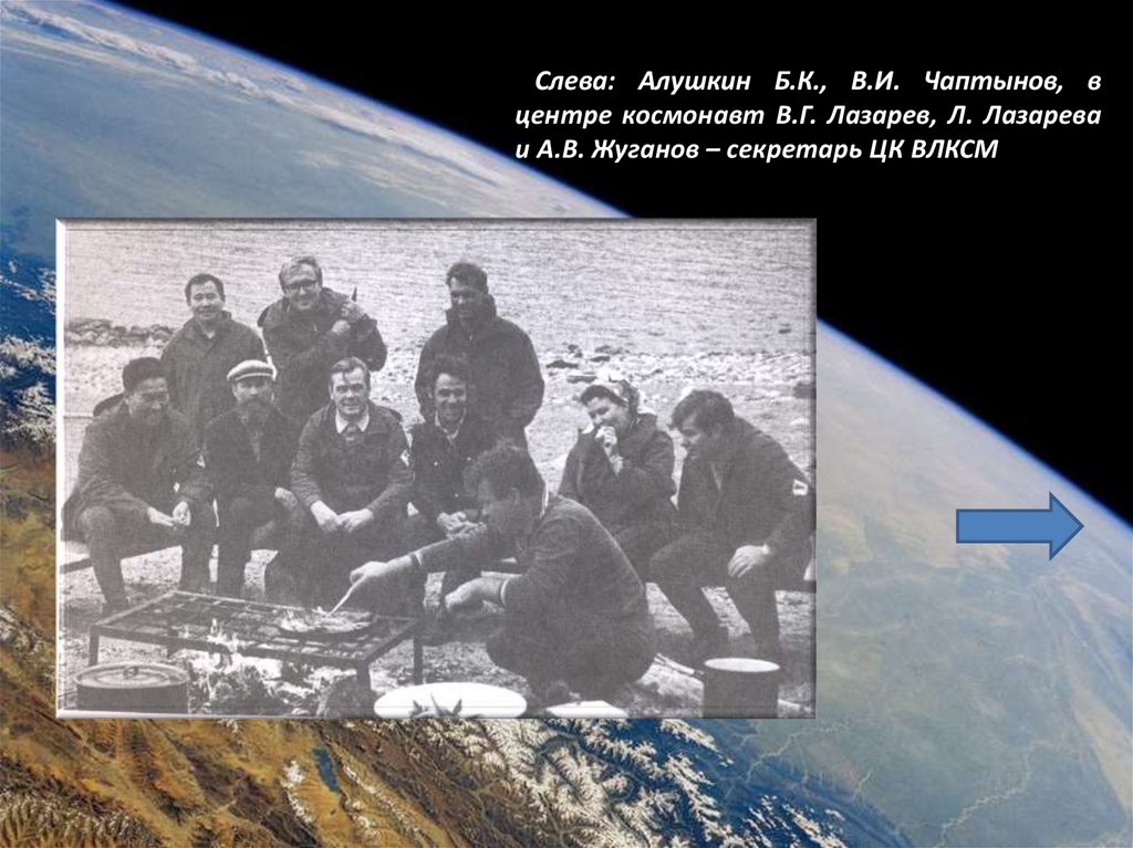 Слева: Алушкин Б.К., В.И. Чаптынов, вцентре космонавт В.Г. Лазарев, Л. Лазарева