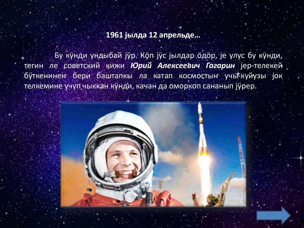 1961 jылда 12 апрельде…Бу кÿнди ундыбай jÿр. Кöп jÿс jылдар öдöр, jе улус бу кÿнди,