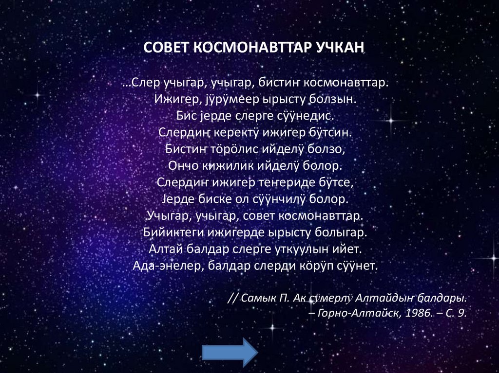 СОВЕТ КОСМОНАВТТАР УЧКАН…Слер учыгар, учыгар, бистиҥ космонавттар.