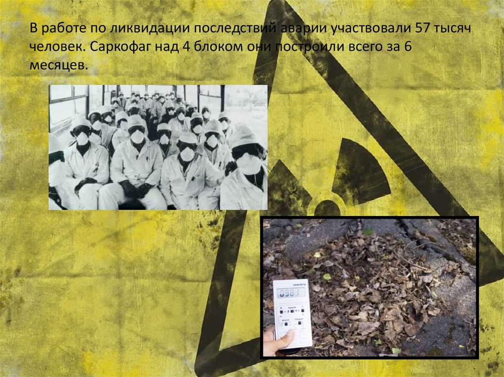 В работе по ликвидации последствий аварии участвовали 57 тысяччеловек. Саркофаг над 4 блоком они построили всего за 6