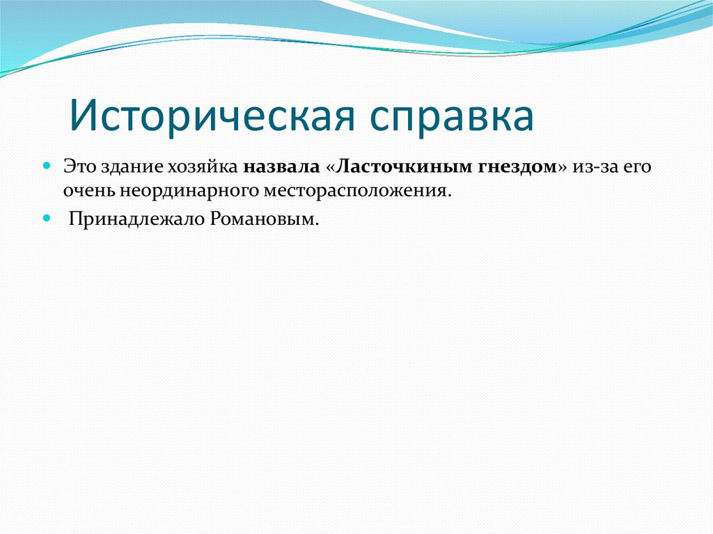 Историческая справкаЭто здание хозяйка назвала «Ласточкиным гнездом» из-за его