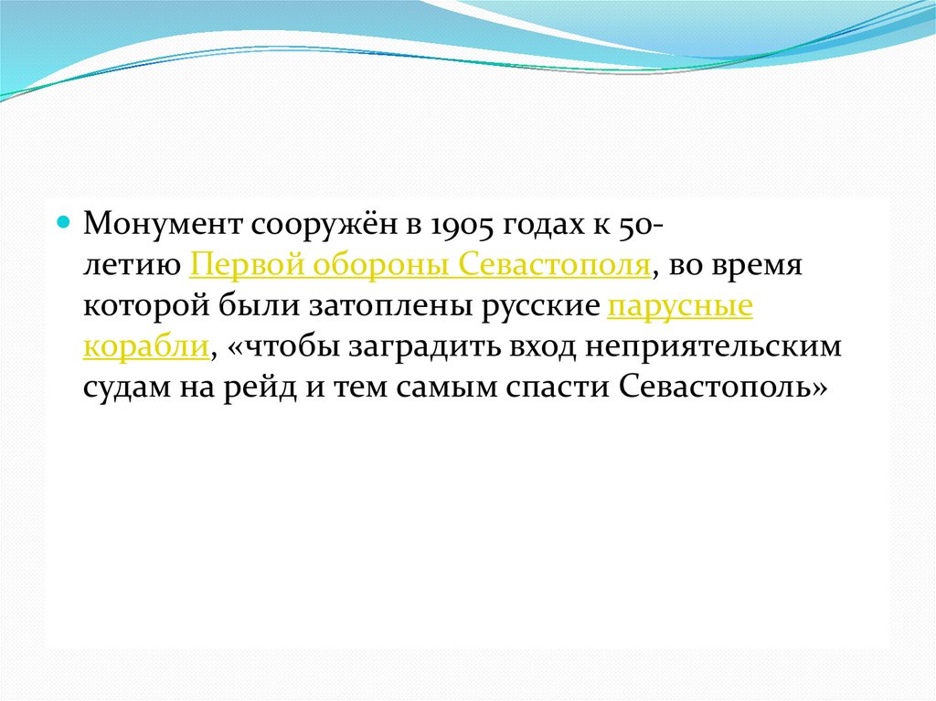 Монумент сооружён в 1905 годах к 50-летию Первой обороны Севастополя, во время