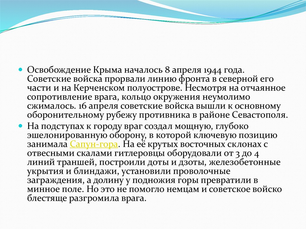 Освобождение Крыма началось 8 апреля 1944 года.Советские войска прорвали линию фронта в северной его