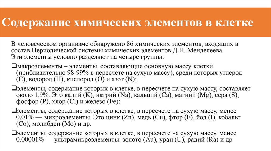 Содержание химических элементов в клеткеВ человеческом организме обнаружено 86 химических элементов, входящих в