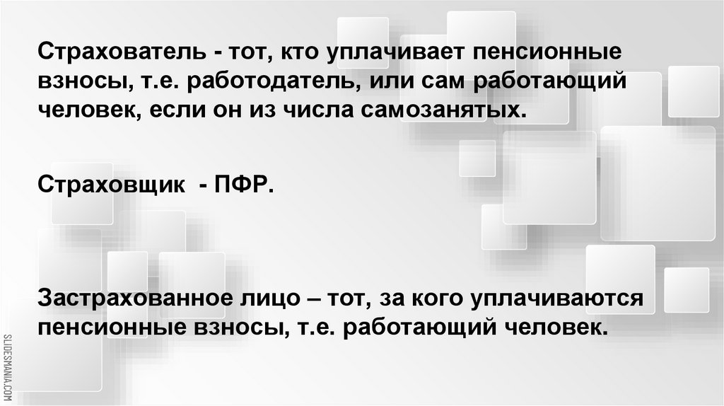 Страхователь - тот, кто уплачивает пенсионныевзносы, т.е. работодатель, или сам работающий