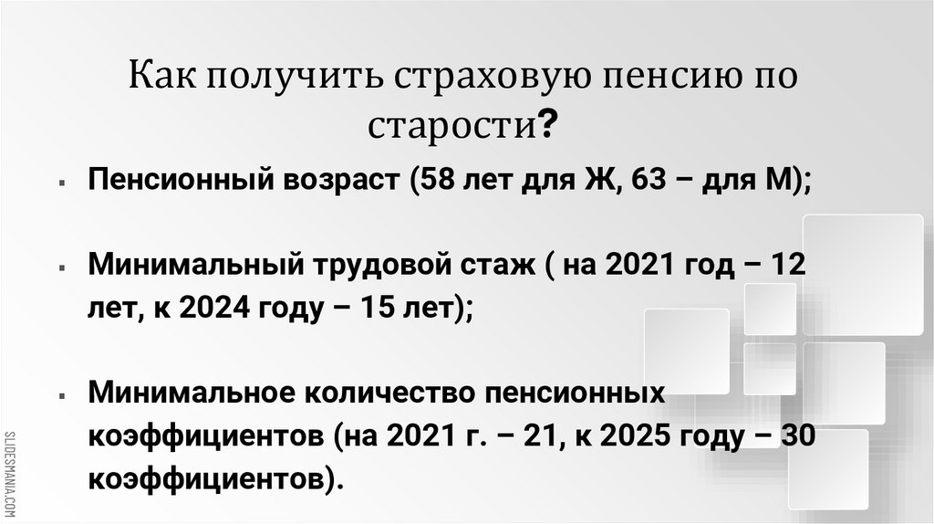 Пенсионный возраст (58 лет для Ж, 63 – для М);