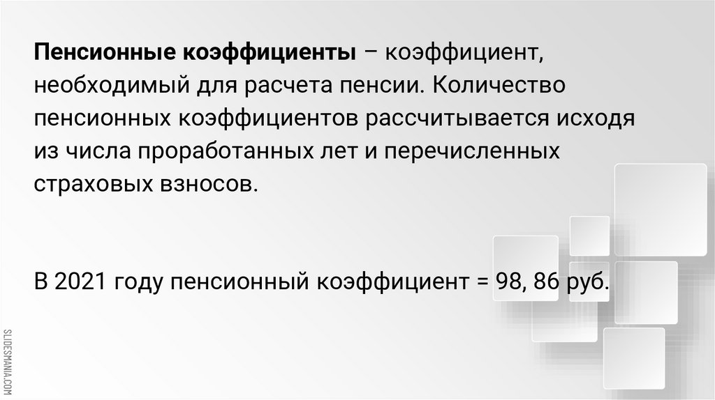 Пенсионные коэффициенты – коэффициент,необходимый для расчета пенсии. Количество