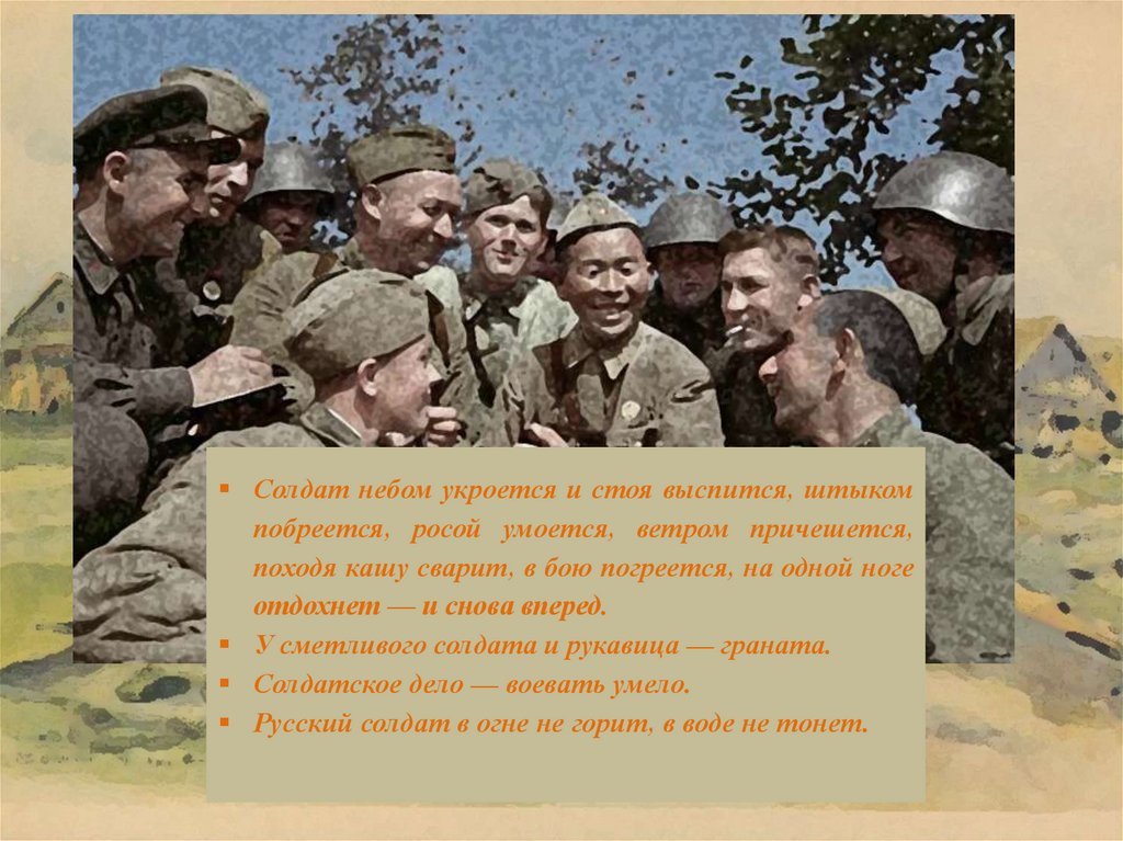 Солдат небом укроется и стоя выспится, штыкомпобреется, росой умоется, ветром причешется,