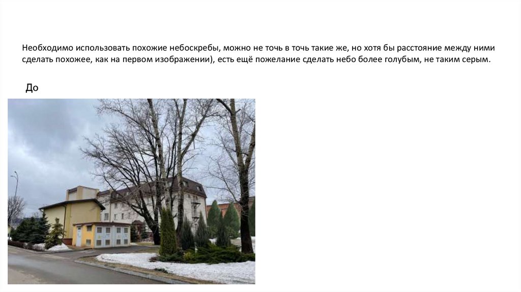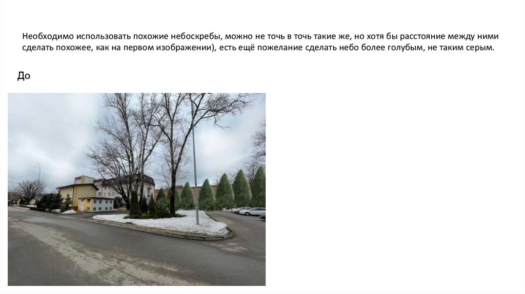 Необходимо использовать похожие небоскребы, можно не точь в точь такие же, но хотя бы расстояние между нимисделать похожее, как на первом изображении), есть ещё пожелание сделать небо более голубым, не таким серым.