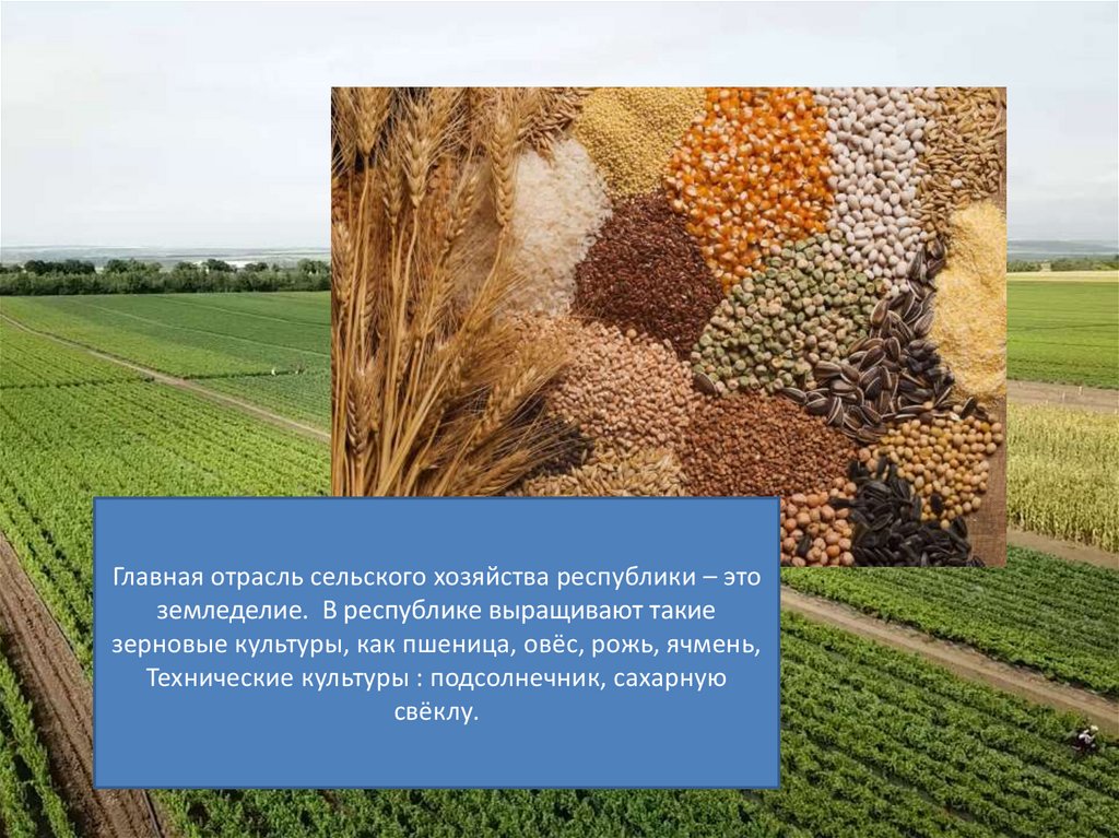 Главная отрасль сельского хозяйства республики – этоземледелие. В республике выращивают такие