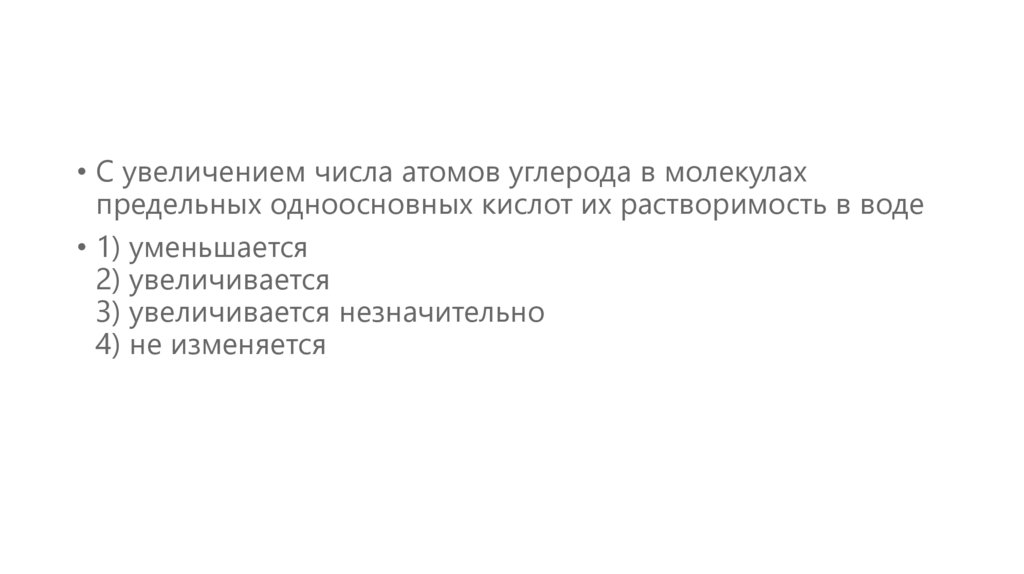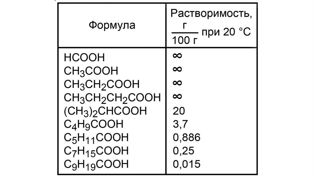 • С увеличением числа атомов углерода в молекулахпредельных одноосновных кислот их растворимость в воде