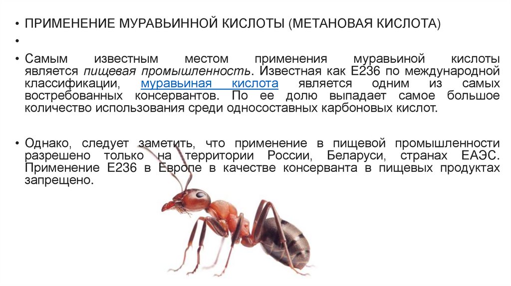 • ПРИМЕНЕНИЕ МУРАВЬИННОЙ КИСЛОТЫ (МЕТАНОВАЯ КИСЛОТА)• Самым