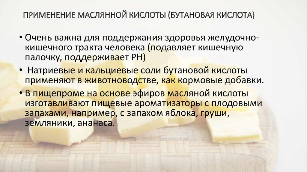 ПРИМЕНЕНИЕ МАСЛЯННОЙ КИСЛОТЫ (БУТАНОВАЯ КИСЛОТА)• Очень важна для поддержания здоровья желудочнокишечного тракта человека (подавляет кишечную