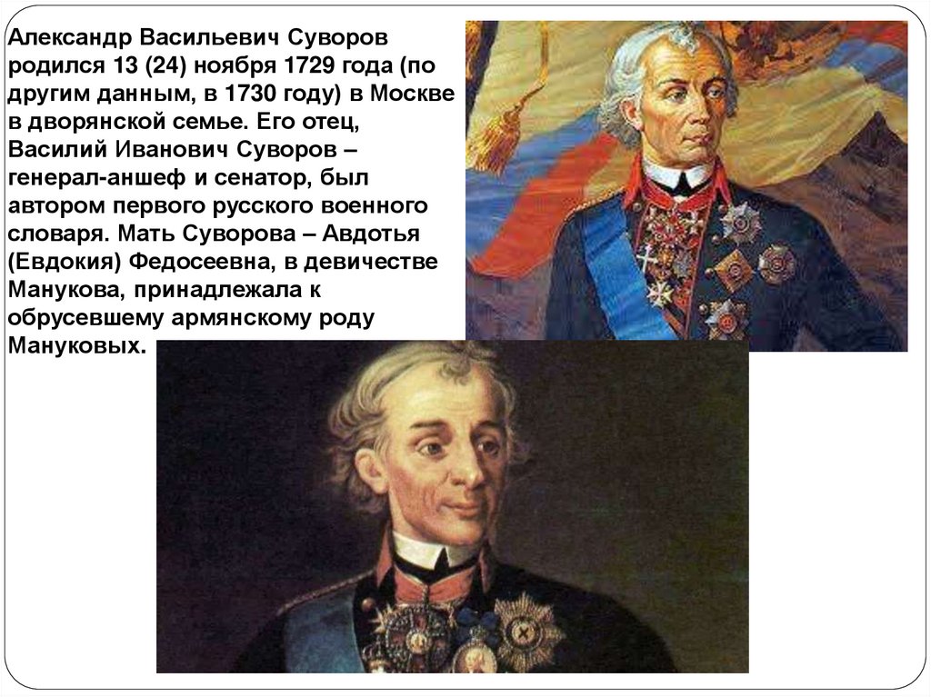 Александр Васильевич Суворовродился 13 (24) ноября 1729 года (по