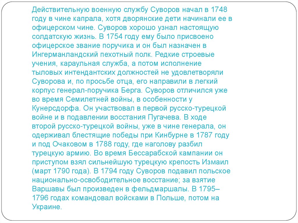 Действительную военную службу Суворов начал в 1748году в чине капрала, хотя дворянские дети начинали ее в