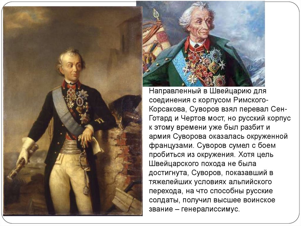 Направленный в Швейцарию длясоединения с корпусом РимскогоКорсакова, Суворов взял перевал СенГотард и Чертов мост, но русский корпус