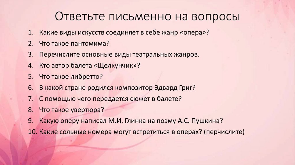 Ответьте письменно на вопросы1. Какие виды искусств соединяет в себе жанр «опера»?