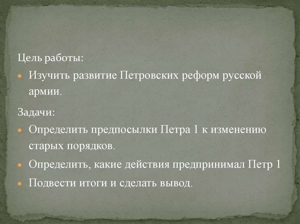 Цель работы:Изучить развитие Петровских реформ русской