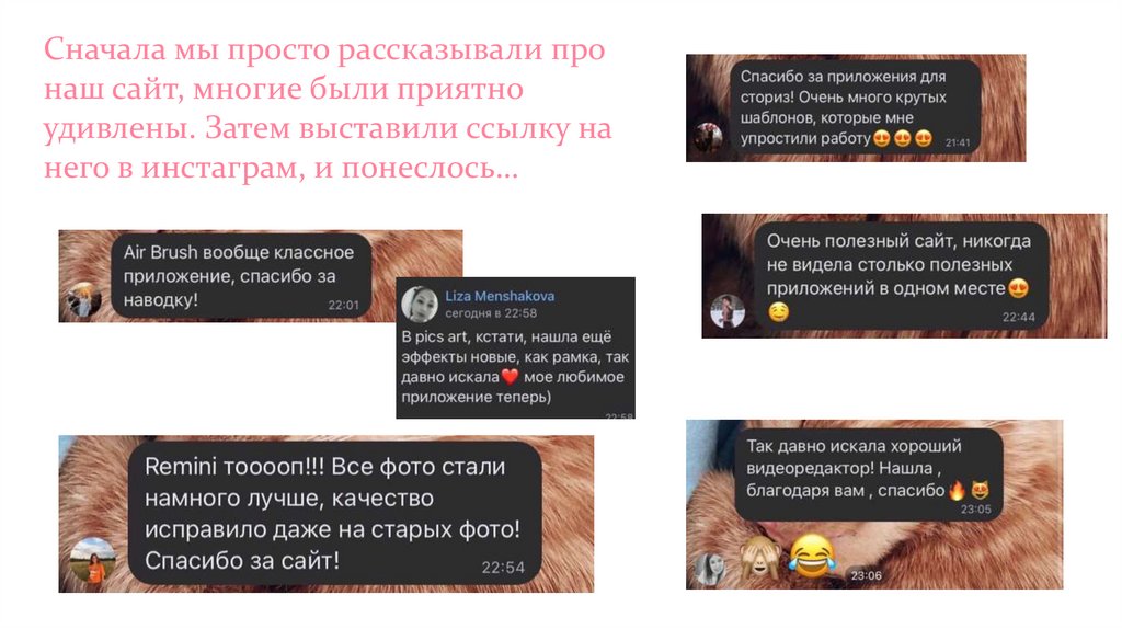 Сначала мы просто рассказывали пронаш сайт, многие были приятно